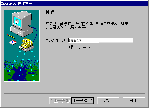 此处填写的是在Outlook express 中您的英文或者拼音名字。它并不影响您的任何工作,只是在您有多个邮箱时可以用来标识是哪个信箱。至此,您已经简单的设置完您的一个信箱。再进行简单的几步设置,就可以开始使用信箱了。
